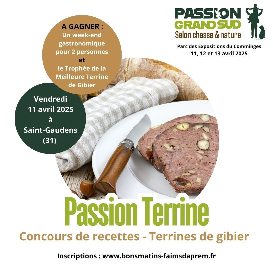 A l’occasion de la 1ère édition du salon Passion Grand Sud, dédié à la chasse et à la nature et organisé du 11 au 13 avril 2025 à Saint-Gaudens (31) , la communauté de communes Cœur et Coteaux du Comminges souhaite mettre en lumière la cuisine de venaison, synonyme de partage et de tradition. Pour ce faire, les organisateurs lancent un concours de recettes, « Passion Terrine », dont la vocation est la présentation/dégustation de terrines inédites à base de gibier, qu’il s’agisse de sanglier, cerf, biche, lièvre, lapin de garenne, faisan etc.